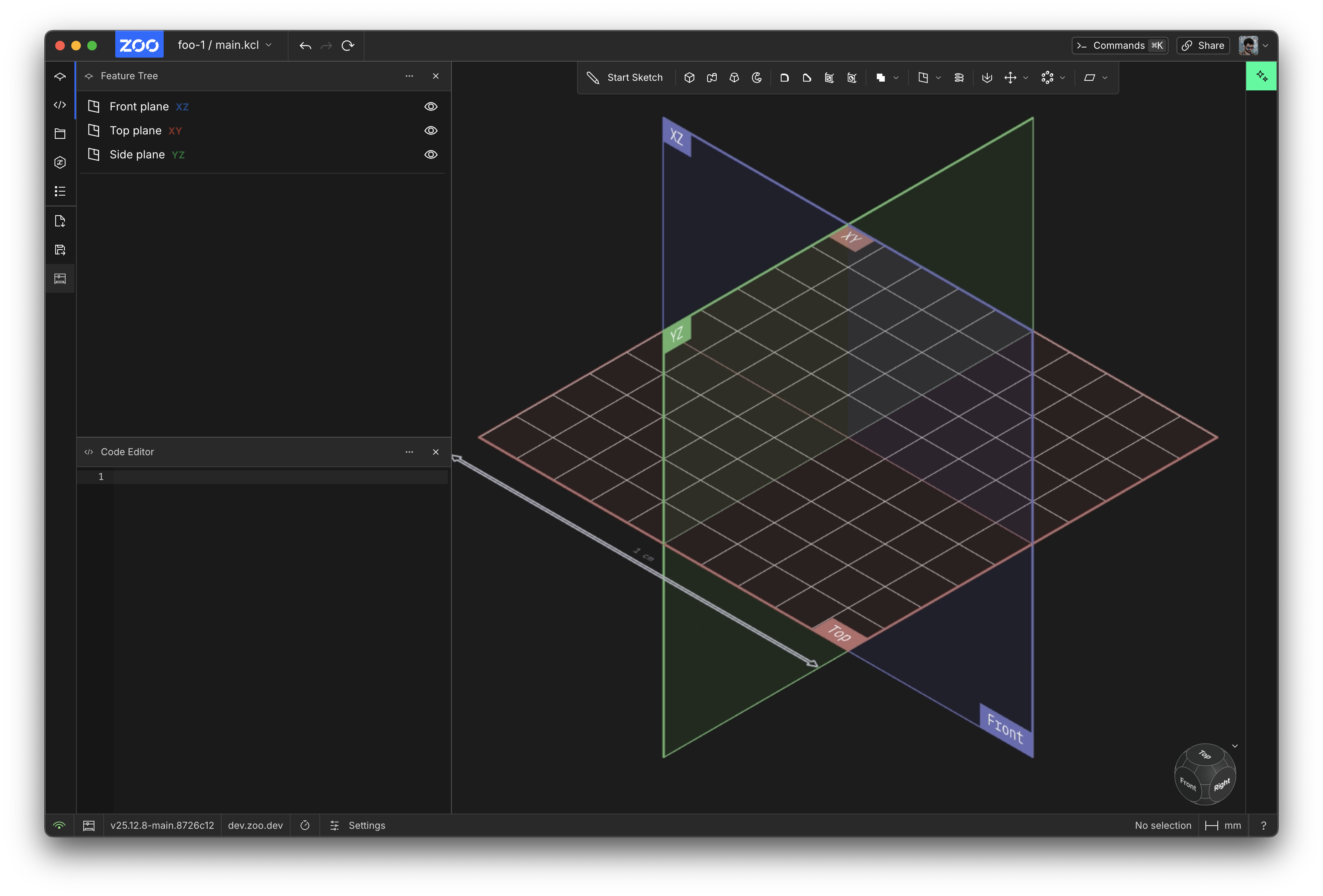 Firstly, the default planes look much better! They've got helpful labels now. Each plane is labelled with both a geometry-friendly name like XY, YZ and XZ, and also a human-friendly name like Top, Front and Side. These human-friendly names are also used in our brand-new orientation cube, in the bottom-right! The old orientation gizmo was a bit hard to use, and we think this cube is a massive improvement. Here's a little demo video.