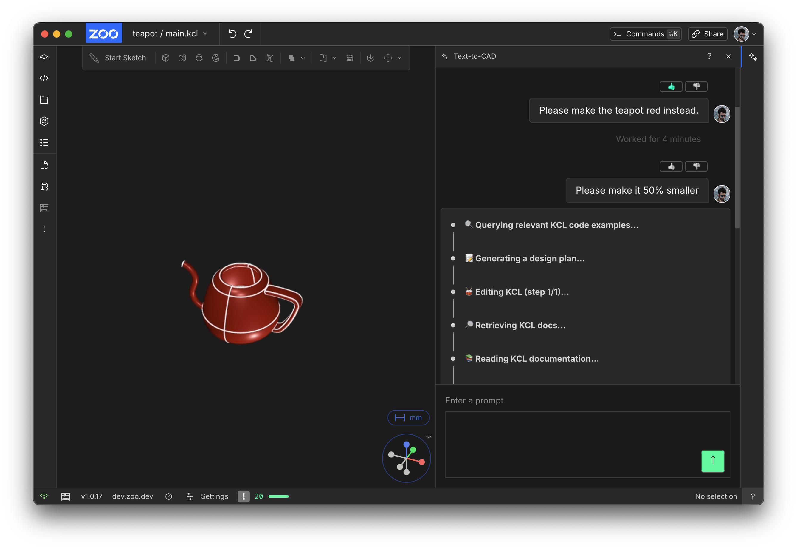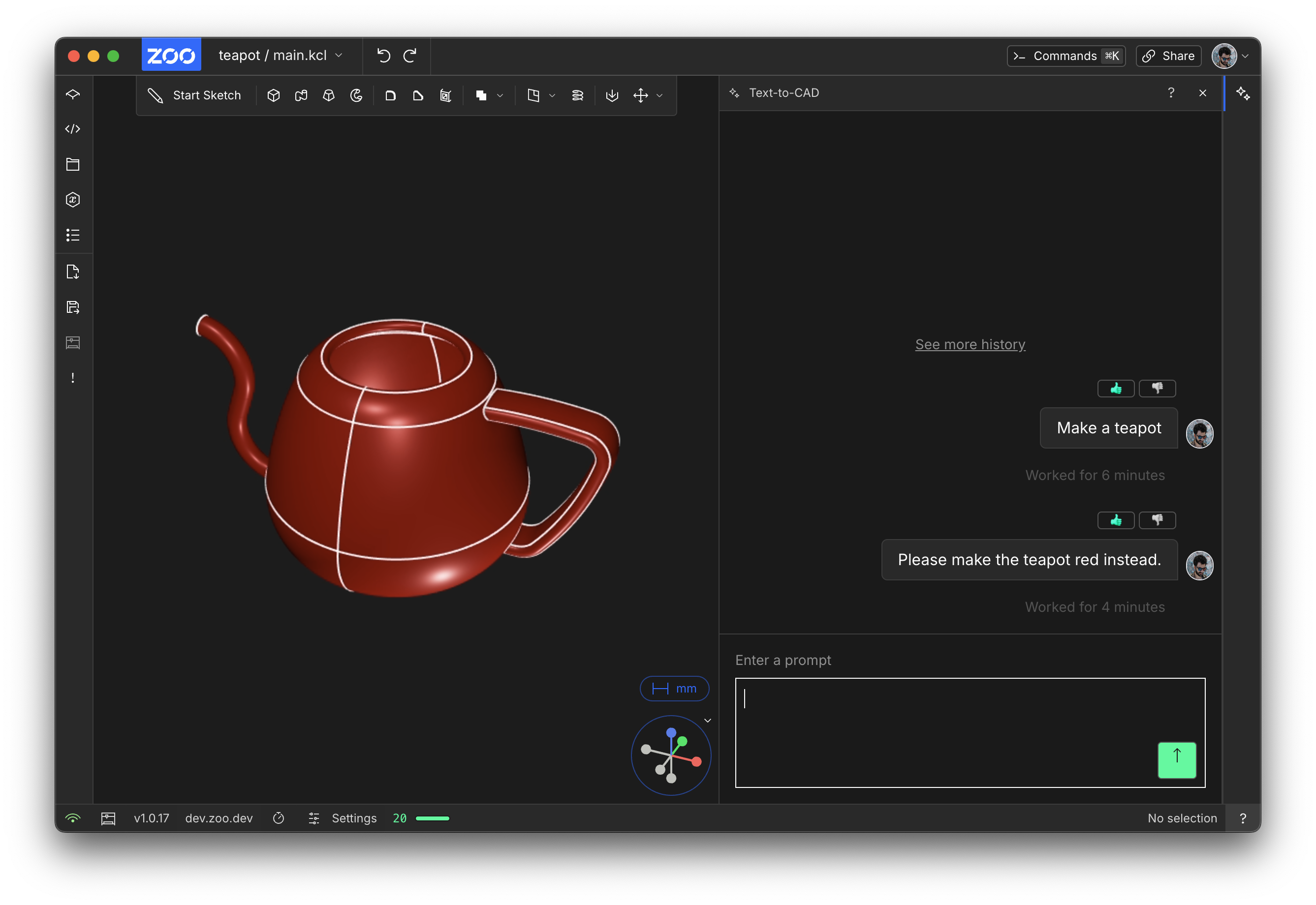 This will be the foundation for a lot of Text-to-CAD improvements we're working on. Text-to-CAD is a big focus for our ML team, and it deserves a dedicated home inside Zoo Design Studio. Try it out and let us know what you think!